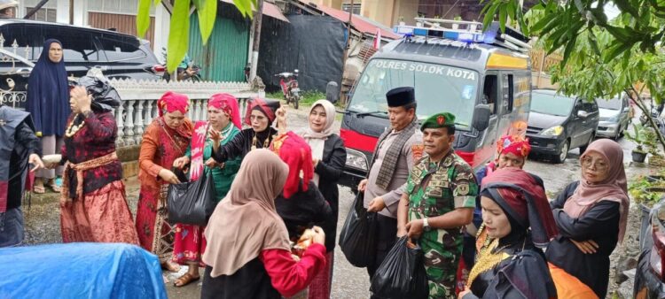 Puluhan perempuan berpakaian khas Bundo Kandung berjalan beriringan, mengangkat gulungan kain sarung mereka agar tidak terseret arus kecil yang mengalir di jalan. Bukan untuk pagelaran adat, bukan pula untuk seremonial. Mereka datang membawa empati—dan ratusan paket nasi bungkus—untuk warga yang hari-hari ini bergelut dengan banjir.