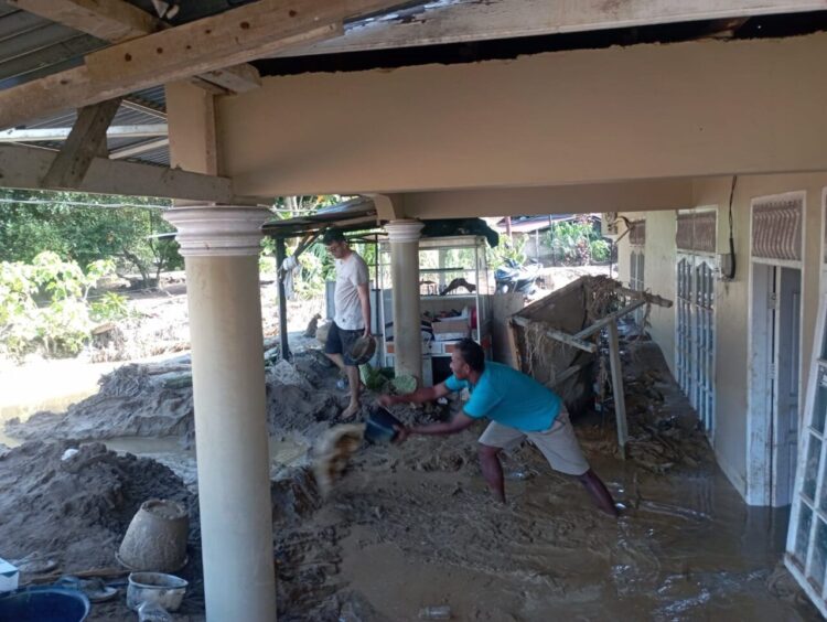 Nando salah seorang warga yang rumahnya terdampak banjir terpaksa menimba air dengan ember. Namun hal itu tak mampu mengeluarkan air dan lumpur dari dalam rumah mereka yang tingginya lebih satu meter.
