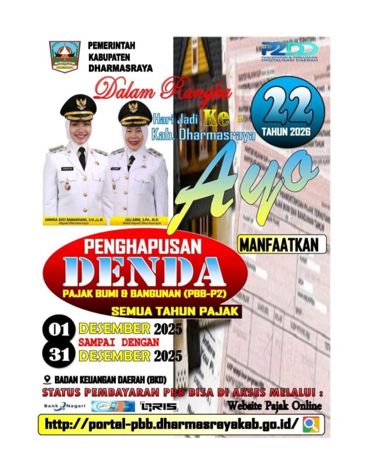 DHARMASRAYA, HARIANHALUAN.ID — Bupati Dharmasraya Annisa Suci Ramadhani, ajak masyarakat memanfaatkan penghapusan sanksi administratif berupa denda pajak bumi dan bangunan pedesaan dan perkotaan.