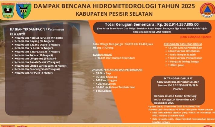 Data ini merupakan pemutakhiran terakhir per 1 Desember 2025 pukul 09.00 WIB, dihimpun dari Pusdalops PB BPBD Kabupaten Pesisir Selatan serta laporan BPBD Provinsi Sumatera Barat. BPBD mengingatkan bahwa angka dampak bencana dapat bertambah sesuai perkembangan situasi dan laporan terbaru dari lapangan. (*)