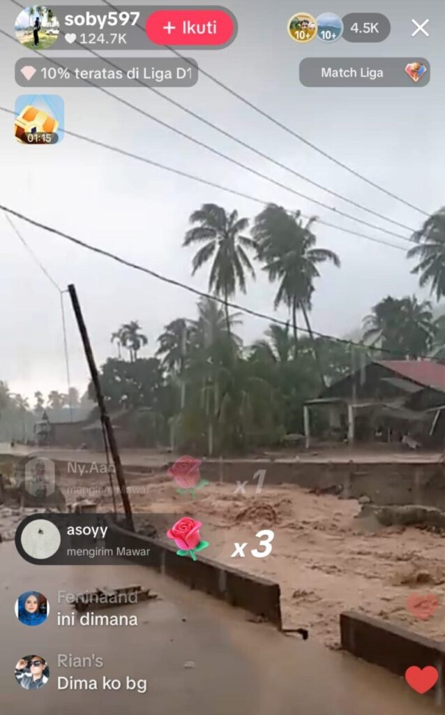 Dalam rekaman siaran langsung akun TikTok @soby597 pada pukul 17.10 WIB, terlihat aliran Batang Kuranji yang membesar dalam hitungan menit.