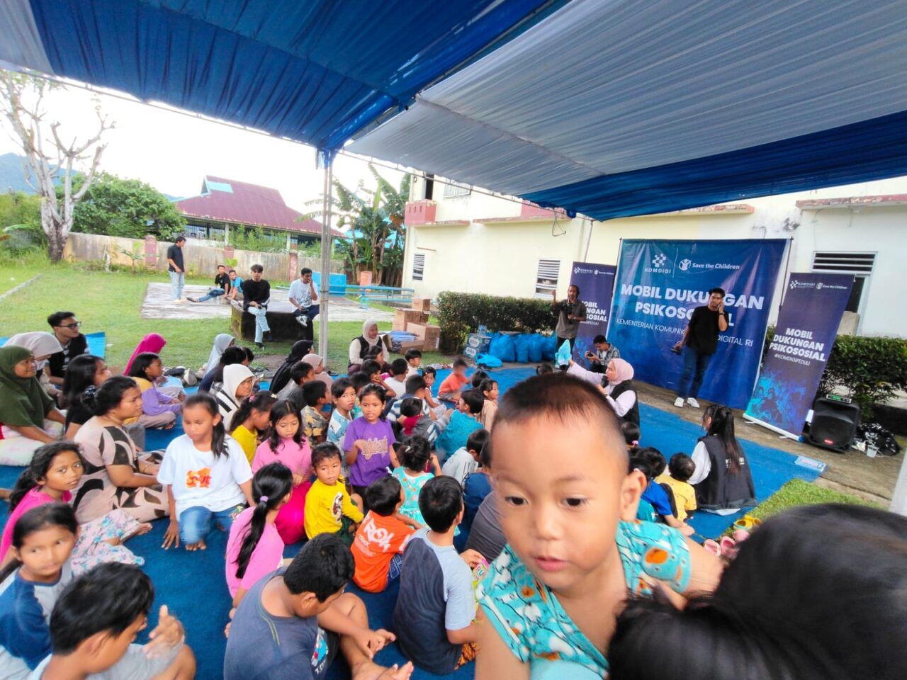 Di depannya, sebuah mobil Dukungan Psikososial milik Kementerian Komunikasi dan Digital (Komdigi) terparkir. Dari dalamnya, relawan menggelar permainan, kertas gambar, dan cerita-cerita sederhana. Ruang aman kecil itu menjadi tempat anak-anak penyintas menurunkan beban yang terlalu berat untuk usia mereka.