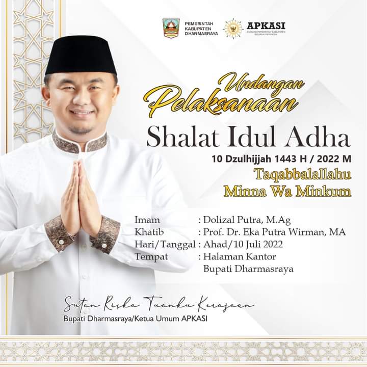 Lebih lanjut diterangkan Sarbaini, Bupati Dharmasraya, Sutan Riska Tuanku Kerajaan, beserta keluarga dijadwalkan akan melaksanakan Shalat Ied di lokasi yang ditetapkan oleh pemkab ini.