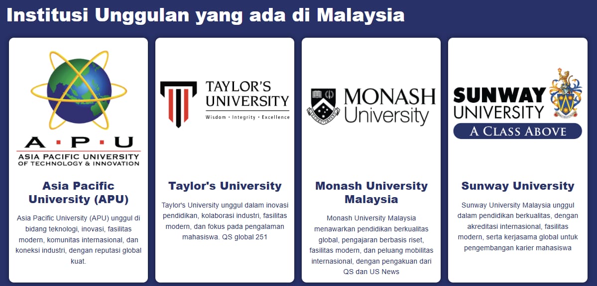 Kuliah di Malaysia menawarkan berbagai keunggulan yang menarik bagi para pelajar internasional. Sebagai salah satu pusat pendidikan tinggi di Asia, Malaysia dikenal dengan sistem pendidikan yang berkualitas tinggi dan biaya kuliah yang relatif terjangkau dibandingkan dengan negara-negara lain. Berikut ini beberapa keunggulan yang bisa kamu dapatkan jika kuliah di Malaysia: