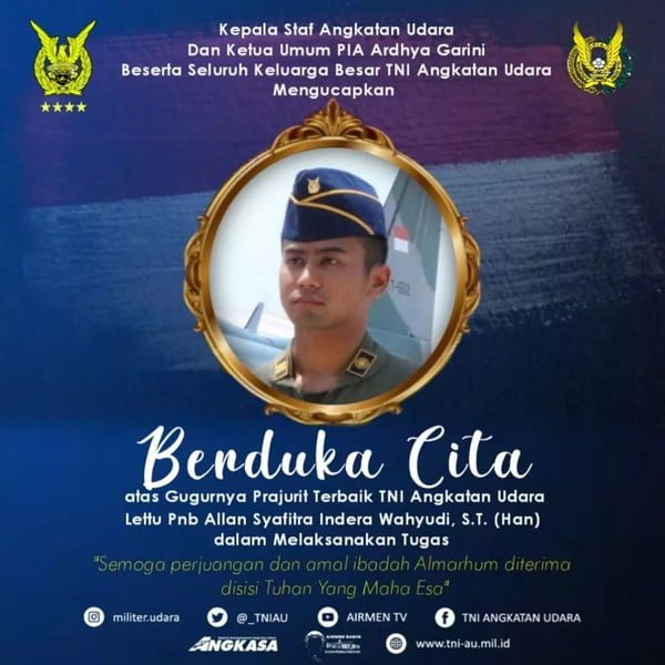 “Lettu Pnb Allan Safitra Indra Wahyudi, S.T (Han) meninggal dunia saat mengalami kecelakaan dalam menjalani latihan terbang malam,” kata Kepala Penerangan Lanud Iswahjudi Madiun, di Magetan, Kapten Sus Yudha Pramono, dilansir dari detiknews.com, Selasa (19/07/22).