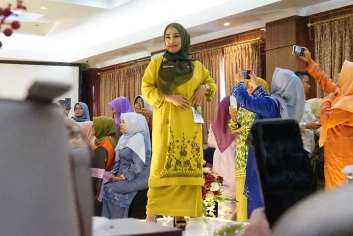 Ketua TP PKK Tanah Datar Ny. Lise Eka Putra pada saat fashion show itu terlihat cantik dan elegan membawakan baju kurung berbahan kain yang lembut crinkle lady lia medium warna hijau lime bermotifkan Sulaman Kapalo Samek yang dibuat pengrajin Rumah Sulam Sefni Nagari Situmbuak Kecamatan Salimpaung Kabupaten Tanah Datar.