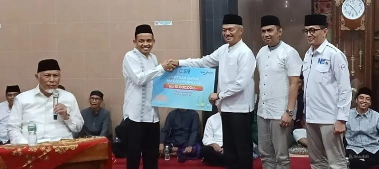 SAWAHLUNTO, HARIANHALUAN.COM — Bank Nagari bantu Masjid Agung Nurul Islam, Sawahlunto Rp10 juta dalam kunjungan Tim Safari Ramadhan Gubernur Sumbar Mahyeldi Ansharullah, baru-baru ini.