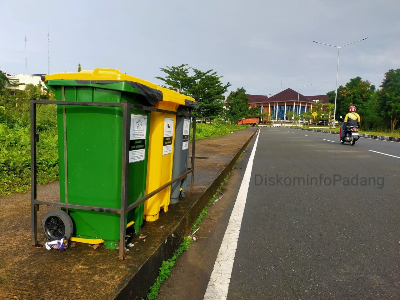 Pandangan berbeda terlihat di jalan dua jalur di belakang Kantor Wali Kota Padang. Sejumlah tempat sampah terpilah berdiri di atas trotoar. Warnanya mencolok.