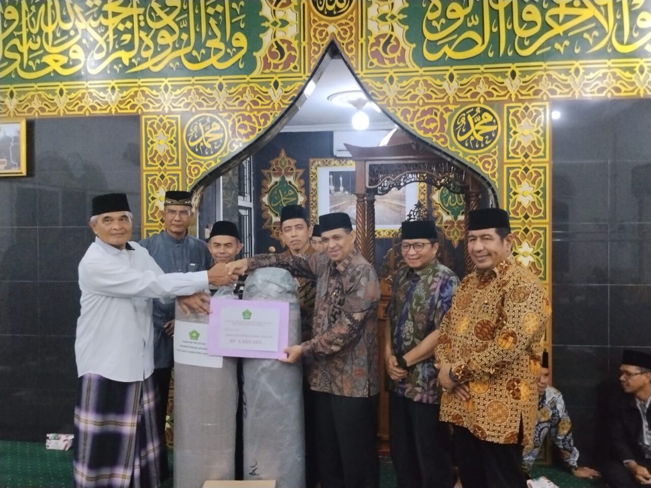 Tim Ramadhan Kanwil Kemenag menyerahkan bantuan berupa tikar, Al Quran dan uang Rp 5 juta. (aye)
