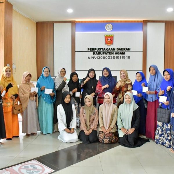 AGAM, HARIANHALUAN.ID — Usai menyalurkan bantuan kepada warga hunian sementara di Kecamatan Tanjung Raya, Ketua TP PKK Kabupaten Agam, Ny. Merry Benniwarlis, kembali menyerahkan bantuan kepada para lanjut usia (lansia) di Gedung Arsip dan Perpustakaan (Arpus) Kabupaten Agam, Lubuk Basung, Jumat (13/3).