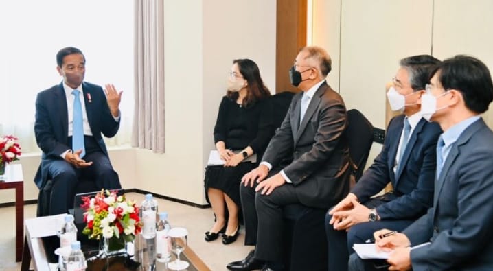HARIANHALUAN.id – Presiden Joko Widodo menerima Executive Chairman Hyundai Motor Group, Chung Eui-sun, di Lotte Hotel, Seoul, pada Kamis, 28 Juli 2022. Dalam pertemuan tersebut, Chairman Hyundai menyampaikan bahwa mereka akan melakukan ekspansi untuk mobil listrik serta penelitian dan pengembangannya di Indonesia.