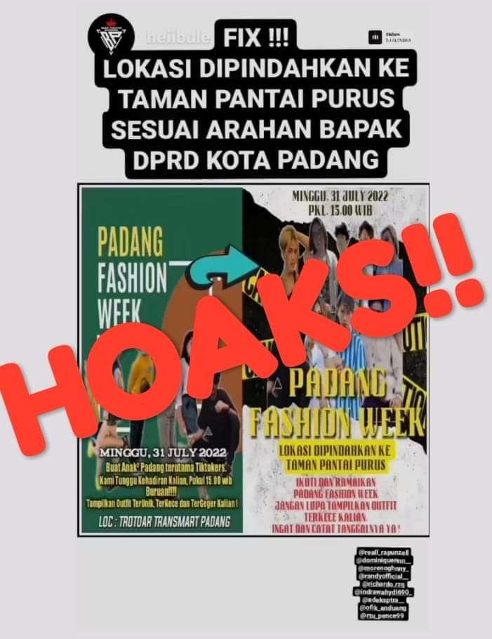 Dari informasi yang berseliweran di jagad digital, kegiatan “Padang Fashion Week” sedianya digelar pada Minggu (31/7/2022) di trotoar Trans Mart di jalan Khatib Sulaiman. Akan tetapi panitia pelaksana akhirnya memindahkan lokasi kegiatan ke Taman Pantai Purus. Dalam poster (flyer) yang beredar di dunia maya tertulis “Fix, lokasi dipindahkan ke Taman Pantai Purus, sesuai arahan Bapak DPRD Kota Padang”.