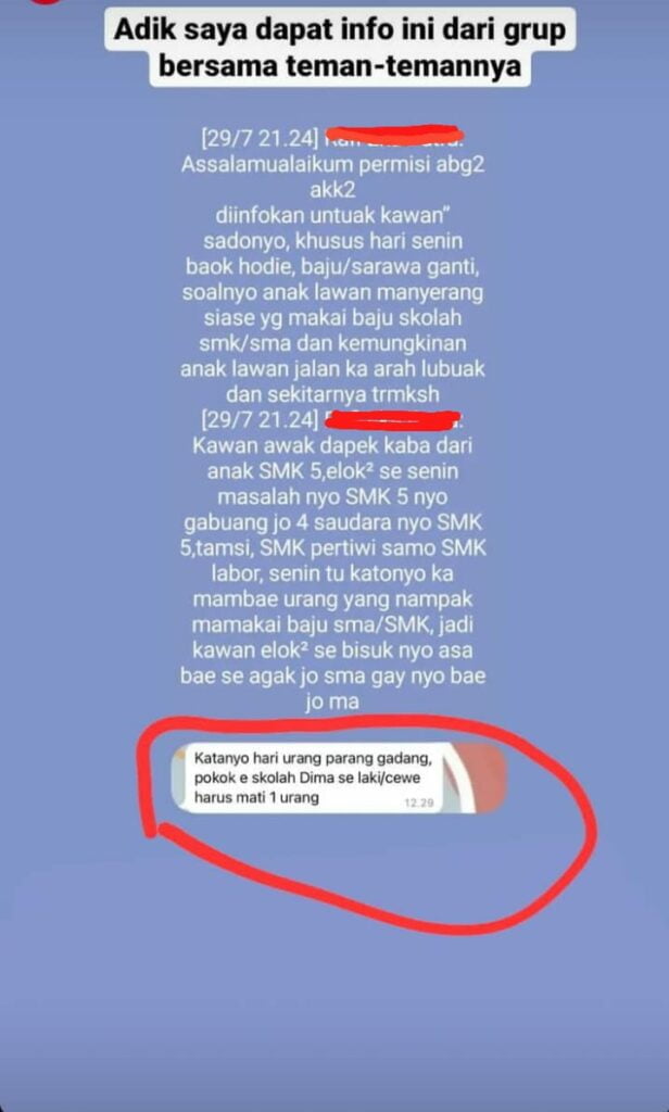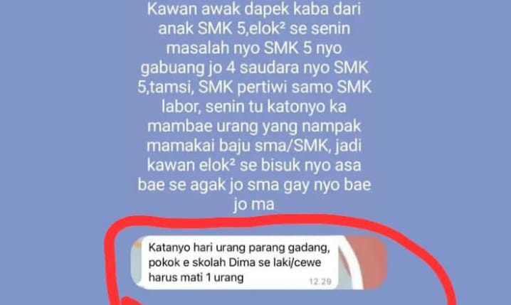 Berikut kutipan pesan info tawuran yang dis-screenshot harianhaluan.id di media sosial WAG yang beredar hari ini, Minggu (31/07/22).