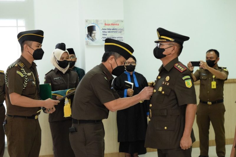 PADANG, HALUAN — Kepala Kejaksaan Tinggi (Kajati) Sumbar, Yusron melantik tiga Kepala Kejaksaan Negeri (Kajari), yakni Erizal sebagai Kajari Bukittinggi, Raymund Hasdianto Sihotang sebagai Kajari Pesisir Selatan, dan Jaka Mulyana sebagai Kajari Solok Selatan, di Lantai III Kejaksaan Tinggi (Kejati) Sumbar, Kamis (10/3/2022).