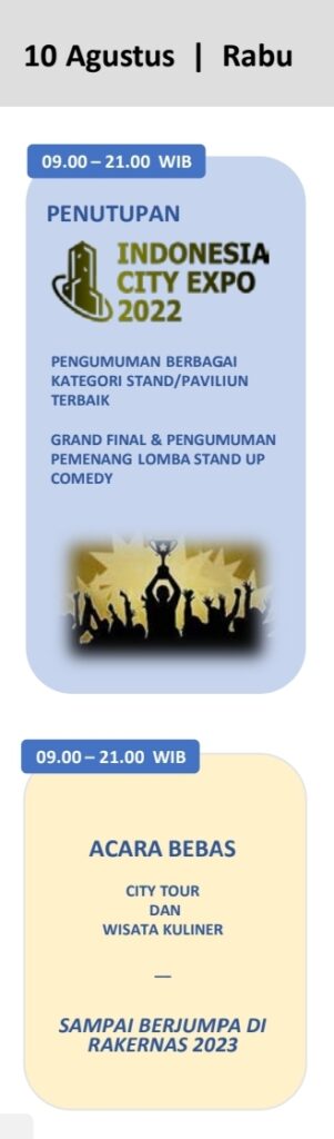 Penutupan Indonesia City Expo 2022 dilakukan pada hari terakhir Rakernas Apeksi, Rabu (10/8/2022). Setelah itu seluruh wali kota beserta istri akan berjalan-jalan keliling Padang sampai berwisata kuliner. (*)
