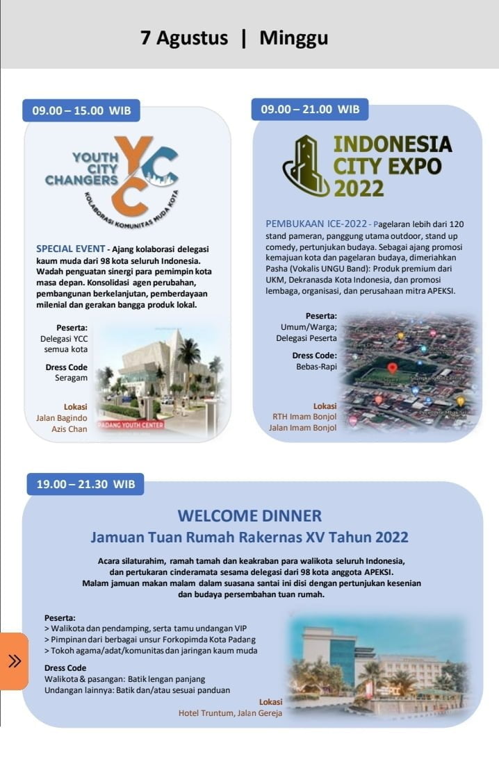 HARIANHALUAN.id – Pada hari Minggu (7/8/2022), tiga kegiatan Rakernas Apeksi XV 2022 digelar hampir secara bersamaan di Padang.