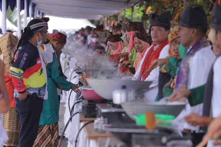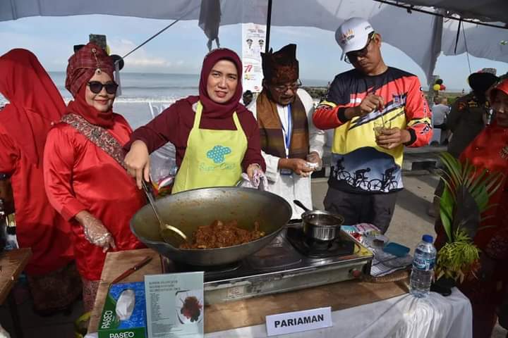 “Kota Pariaman juga terkenal dengan rendangnya yang sangat lezat, dan mempunyai bumbu yang lengkap, serta teh talua yang khas, maka kami memutuskan untuk memeriahkan lomba marandang dan membuat teh talua ini,” ujar Walikota Pariaman, Genius Umar bersama istri yang tampak semangat mengikuti lomba tersebut.
