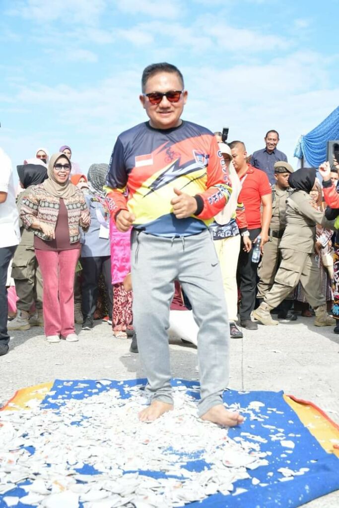 Marten A Taha langsung menuju tumpukan beling yang berada di Pantai Purus, tempat berlangsungnya Lomba Merandang dan Membuat Teh Talua, Selasa (9/8/2022). Dirinya dengan percaya diri mencoba menginjak beling. Waktu itu kakinya masih beralaskan sepatu.