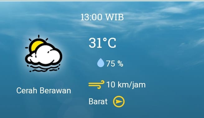 Berdasarkan info bmkg.go.id, Kota Padang dan sekitar cerah berawan dari pagi sampai malam hari. Suhu kelembaban 24 derajat celcius pagi hari, 31 derajat celcius siang hari dan 27 derajat celcius sore.