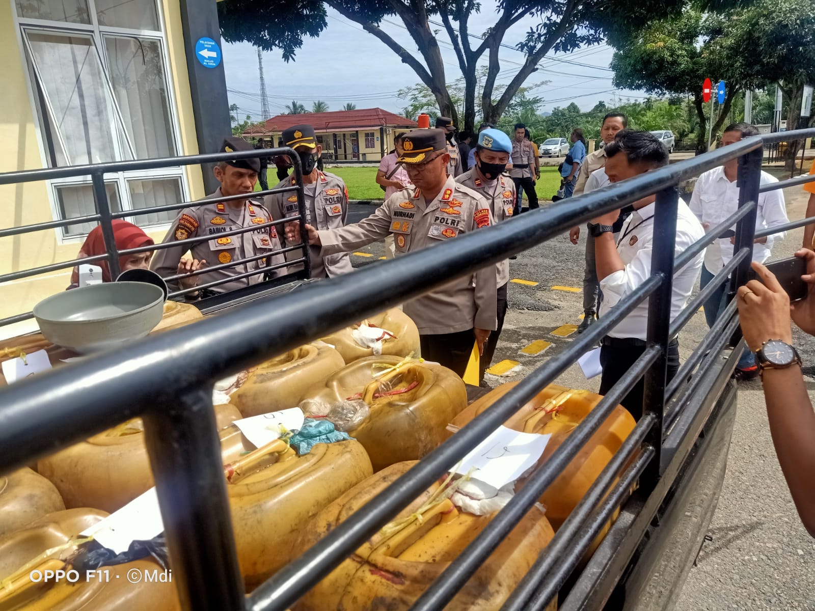 Kapolres Dharmasraya AKBP Nurhadiansyah, SIP didampingi Kasat Reskrim Iptu Dwi Angga Prasetyo, melihat barang bukti penangkapan penyalahgunaan BBM bersubsidi. FOTO: MARYADI