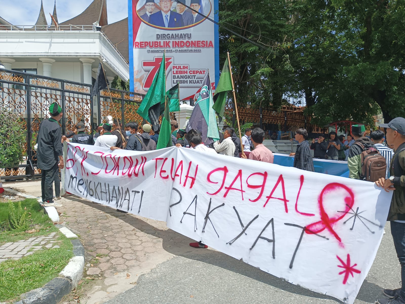 Pantauan media ini di lapangan, sekira pukul 13.40 WIB puluhan massa aksi yang membawa spanduk protes dilengkapi dengan bendera panji hijau hitam khas HMI, tampak bergerak menuju pintu barat DPRD Sumbar dan bergantian menyampaikan orasi.