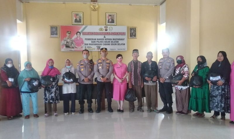 HARIANHALUAN.ID – Meringankan beban masyarakat yang masih terdampak akibat pandemi Covid-19, Kepolisian Resor (Polres) dan Bhayangkari cabang Solok Selatan menggelar doa bersama dan pemberian Bantuan Sosial (Bansos) kepada masyarakat di Aula Sanika Satyawada Polres Solok Selatan, Selasa (6/9/2022).