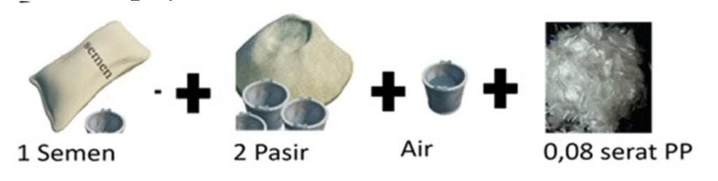 - Siapkan serat polypropylene fiber untuk dttambahkan pada campurran mortar dengan perbandingan campuran PFM adalah 1 Semen: 2 Pasir: 0,08 serat polyprophele dan air secukupnya.