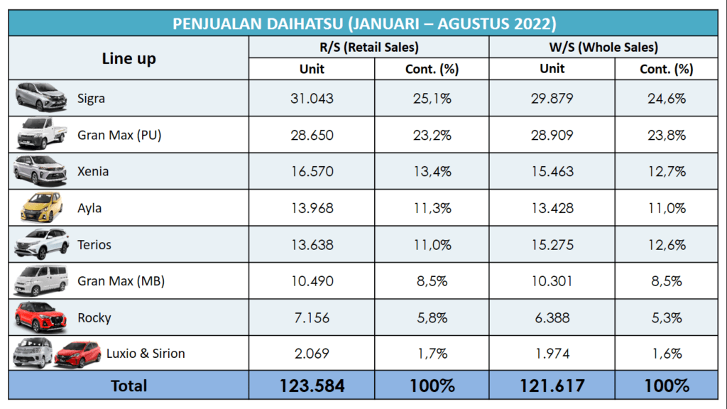 Secara volume dan kontribusi model, penjualan ritel Daihatsu hingga Agustus 2022 tetap didominasi oleh top 3 model, seperti Sigra sebanyak 31.043 unit, atau berkontribusi 25,1%; disusul Gran Max PU (Pick Up) sebanyak 28.650 unit (23,2%); dan Xenia dengan raihan 16.570 unit (13,4%).