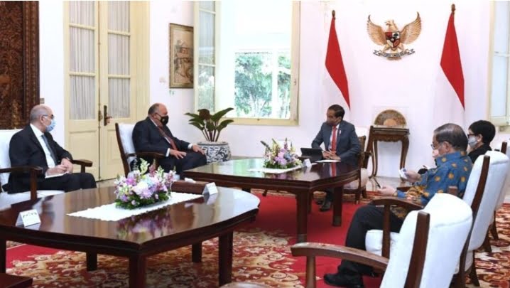 HALUANNEWS, JAKARTA – Presiden Joko Widodo menerima kunjungan kehormatan delegasi Republik Arab Mesir yaitu Menteri Luar Negeri Mesir Sameh Shoukry di Istana Merdeka, Jakarta, pada Jumat (18/03/22).