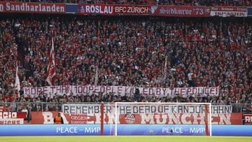 “Lebih dari 100 orang dibunuh oleh polisi,” bunyi tulisan merah dalam spanduk putih yang dibawa pendukung Bayern.