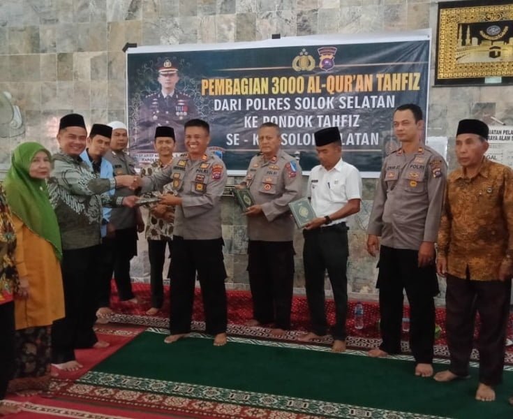 HARIANHALUAN.ID – Kepolisian Resor (Polres) Solok Selatan membagikan sebanyak 3.000 Al-Qur’an Tahfiz ke seluruh pondok tahfiz, melalui koordinasi Badan Komunikasi Pemuda Remaja Masjid Indonesia (BKPRMI) dan Forum Rumah Tahfiz Solok Selatan.