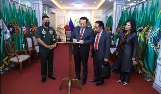 Mantan Ketua DPD RI (2009-2016) Irman Gusman saat menuliskan pesan khusus untuk Angkatan Darat Filipina, disaksikan Kepala Staf ad interim Mayor Jenderal Jose Eriel M. Niembra di Markas Besar Angkatan Darat Filipina di Manila, pada 10 November 2022.