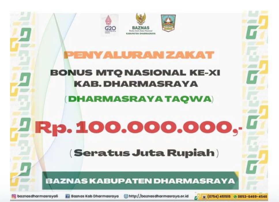HARIANHALUAN.ID – Badan Amil Zakat Nasional (Baznas) Kabupaten Dharmasraya ikut berpartisipasi pada MTQ Nasional XI, dengan memberi apresiasi berupa uang tunai total Rp100.000.000 bagi para pemenang satu.
