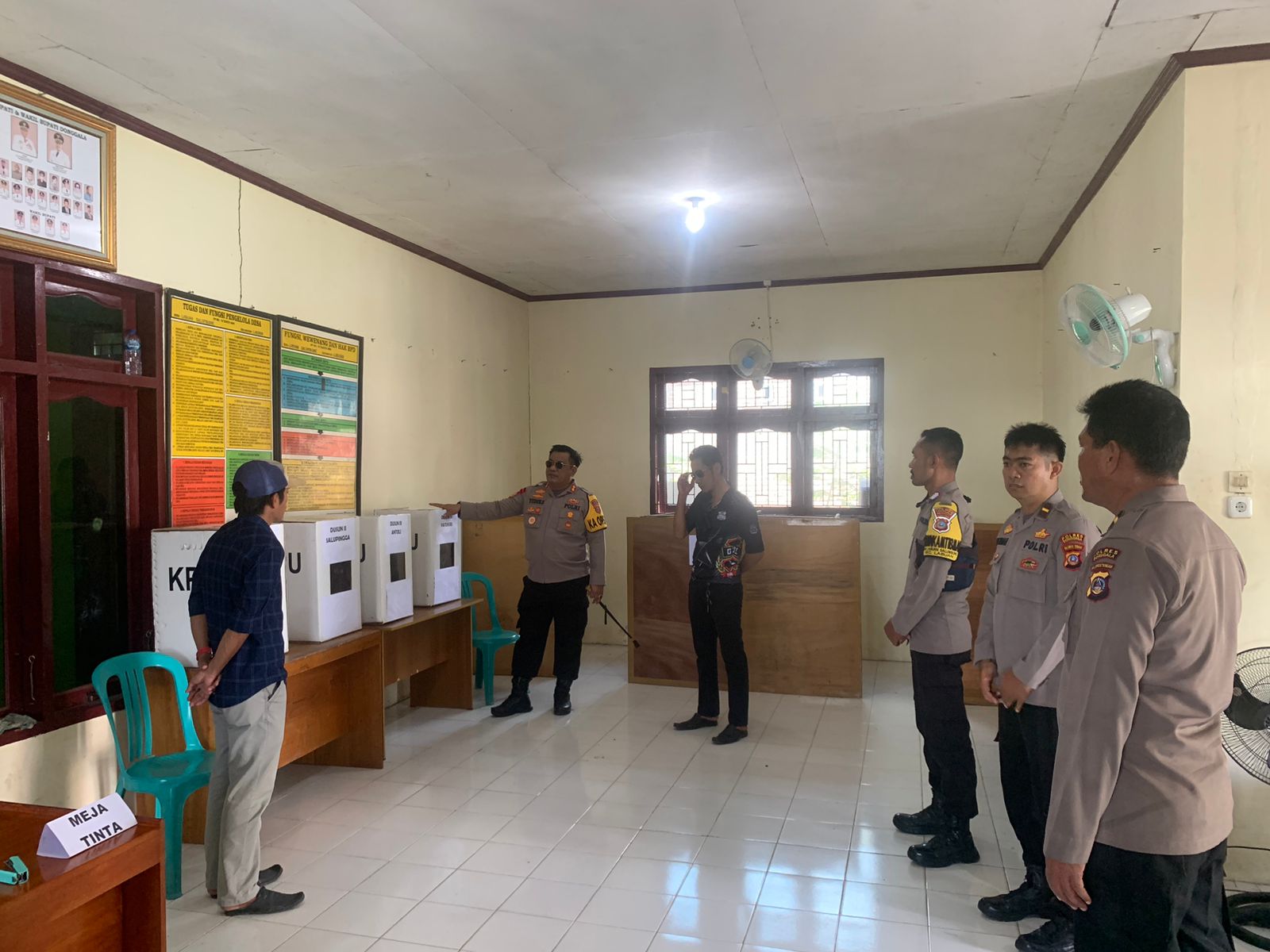 HARIANHALUAN.ID – Kapolres Donggala bersama Kapolsek Labuan mengecek Tempat Pemungutan Suara (TPS) Pilkades Desa Labuan Salumbone, Kecamatan Labuan, Kabupaten Donggala, Provinsi Sulawesi Tenggara (Sulteng), Sabtu (26/11/2022).