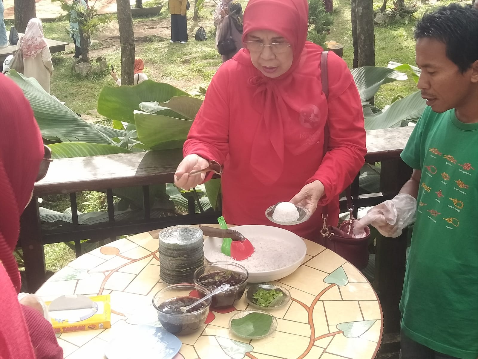 Anggota DPD RI, Emma Yohanna saat mencicipi salah satu makanan dari Nagari Lawang, Kecamatan Matur. Peri