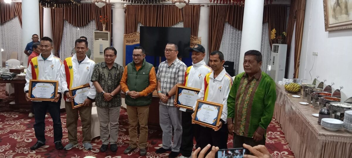 Saat itu Bupati Eka Putra langsung menyerahkan piagam penghargaan kepada empat wartawan peserta Porwanas tersebut. (Feri Maulana)