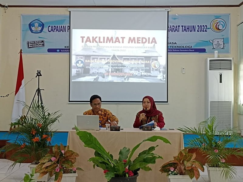 Hal tersebut disampaikan Kepala Balai Bahasa Sumbar, Eva Trisna saat Taklimat Media untuk menyampaikan capaian kinerja sepanjang Tahun 2022 di Aula Balai Bahasa Provinsi Sumbar, Jalan Simpang Alai, Cupak Tangah, Kecamatan Pauh, Kota Padang, Rabu (28/12/2022).