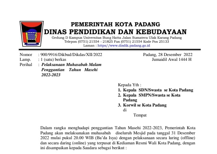 Surat edaran Disdukbud Padang tersebut menyebar di group whats app parenting orang tua siswa. Berikut isi edaran Dinas Dikbud Kota Padang dalam rangka Pelaksanaan Muhasabah Malam Penggantian Tahun Masehi 2022-2023 tersebut.
