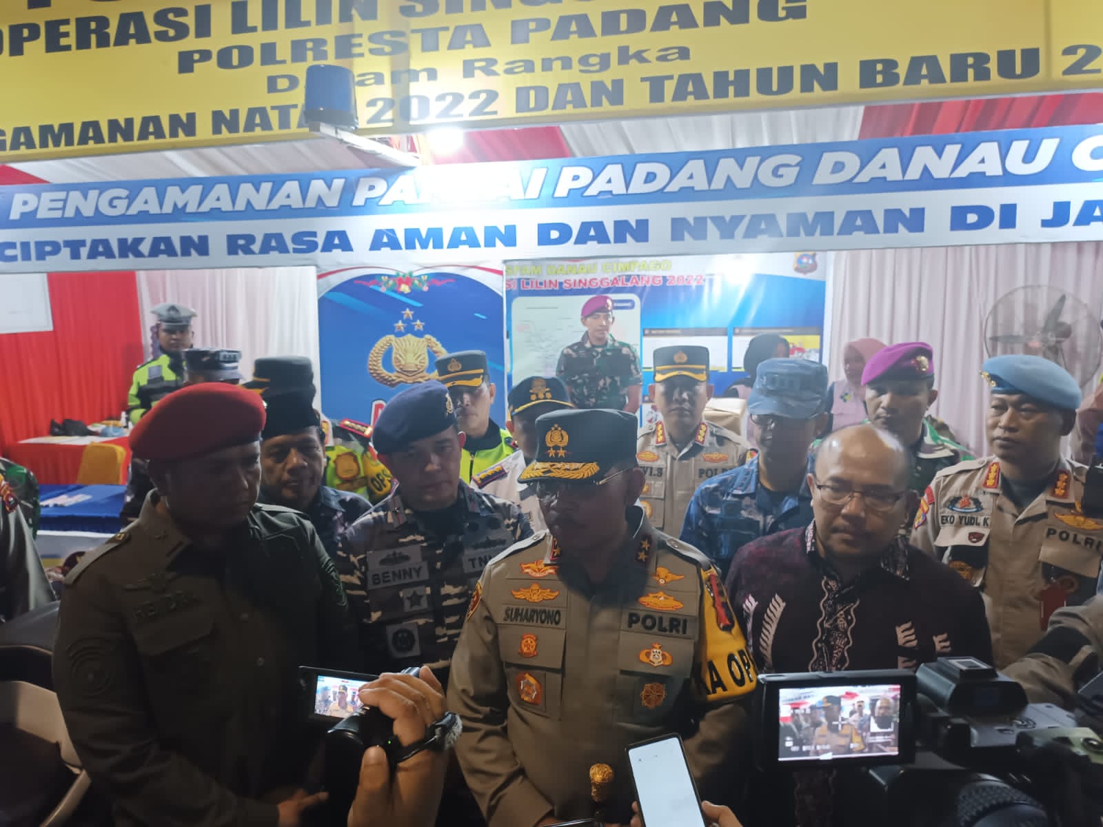 HARIANHALUAN.ID – Jelang malam pergantian Tahun 2023, Kapolda Sumbar, Irjen Pol Suharyono beserta rombongan Forkopimda meninjau posko pengamanan perayaan natal dan tahun baru (Nagari) 2023 di kawasan Pantai Padang, Danau Cimpago, Kota Padang, Sabtu (31/12/2022) malam.