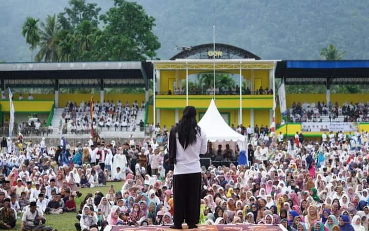 HARIANHALUAN.id – Ribuan jamaah yang berasal dari penduduk Solok Selatan menunjukkan antusiasmenya mendengarkan tausiah dari Gus Miftah. Tribun hingga lapangan di GOR Rimbo Tangah pun dipadati oleh jamaah yang datang dari pelosok nagari.