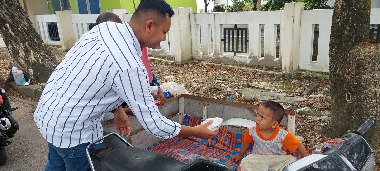 Video yang berdurasi satu menit tersebut dilihat ribuan warganet dan menjadi perbincangan, karena terlihat di dalam video yang diunggah oleh salah satu media sosial di instagram, laki-laki yang memakai baju kemeja putih memakai motor besar tidak malu membagikan nasi bungkus dengan sendiri, dimana nasi tersebut ia gantung di jok depan motornya.