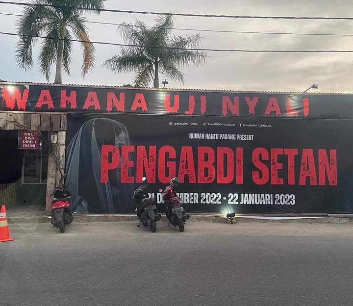 “Untuk izin yang dimiliki sudah lengkap dan pemilik juga sampaikan permohonan maaf. Spanduk yang dipasang awalnya bertuliskan “Wahana Uji nyali Rumah Hantu Padang” lantaran adanya tema yang dibuat pemilik sekali lima belas hari, maka baru-baru ini dipasang tema “Pengabdi Setan”,” tutur Mursalim.
