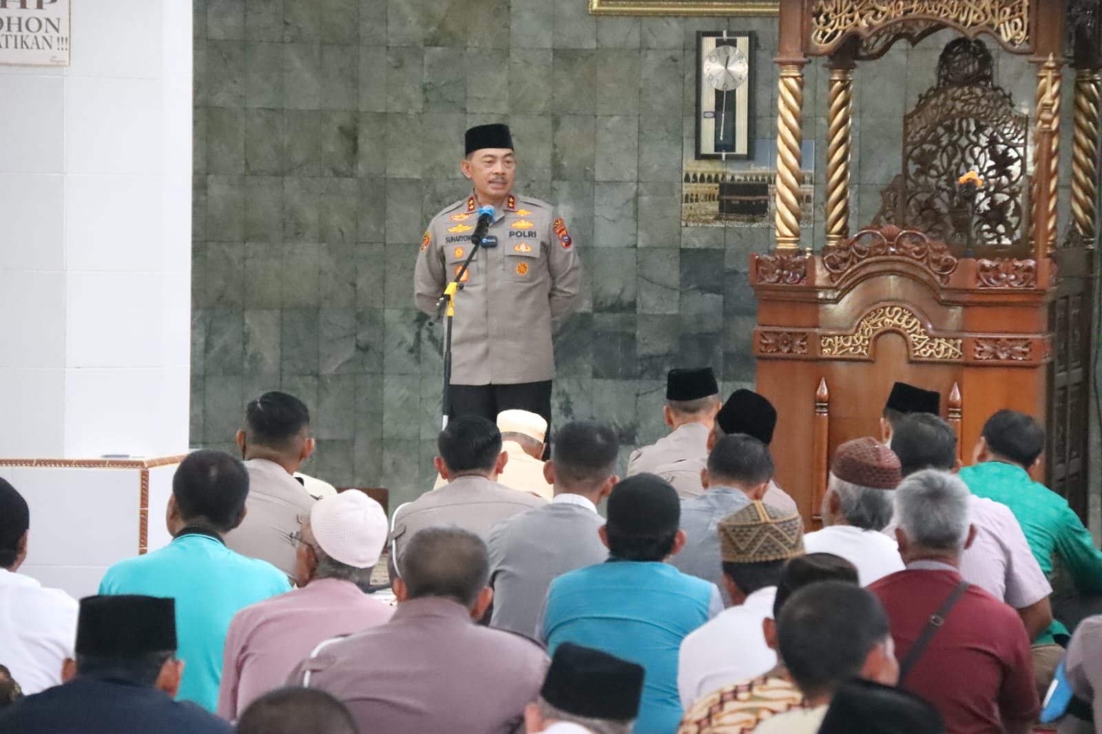 HARIANHALUAN.ID – Kapolda Sumatra Barat (Sumbar), Irjen Pol Suharyono melaksanakan salat Jumat di Masjid Raya Koto Tangah, Balai Gadang, Jumat (20/1/2023). Kegiatan ini dalam rangka silaturahmi Kapolda Sumbar dalam momen ‘Jumat Berkah’ dan ‘Jumat Curhat’.