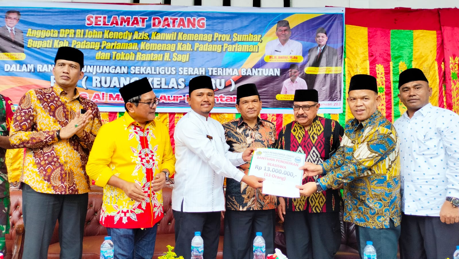 HARIANHALUAN.ID – Anggota DPR RI dari Fraksi Golkar, Jhon Kenedy Azis didampingi Kepala Kantor Wilayah Departemen Agama Sumatra Barat, Helmi menyerahkan bantuan RKB senilai Rp150 juta kepada MTsS Aur Malintang, Minggu (22/1/2023).