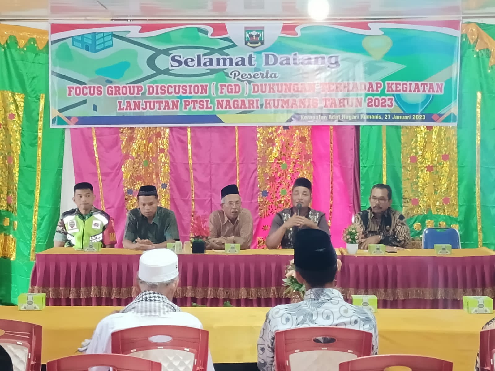 Kegiatan FGD ini difasilitasi oleh Pemerintah Nagari Kumanis yang dilaksanakan di kantor wali nagari setempat. Acara tersebut dibuka langsung oleh Camat Sumpur Kudus dan didampingi ketua dan pengurus KAN, serta ninik mamak. Turut hadir Wali Nagari Kumanis, Sumiki Kamel, Ketua BPN Kumanis, Roni Afrison, Ketua bundo Kanduang Nagari Murtianis dan Babinsa Kumanis, M Hadi.