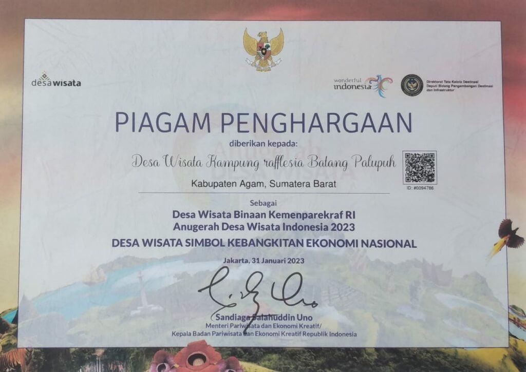 Penghargaan tersebut diterima sebagai Desa Wisata Kampung Raflesia Batang Palupuh dan menjadi Desa Wisata Binaan Kemenparekraf RI, dalam gelaran Anugerah Desa Wisata Indonesia 2023 dengan tema “Desa Wisata Simbol Kebangkitan Ekonomi Nasional”.
