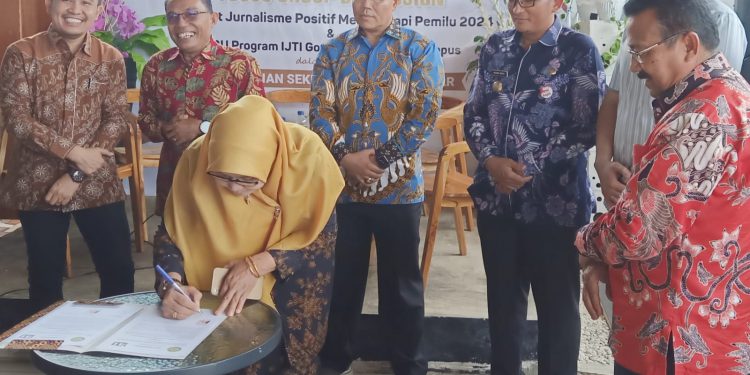 PADANG, HARIANHALUAN.ID — Marliza Kepala MAN 1 Kota Padang menandatangani nota kesepahaman antara MAN 1 Kota Padang dengan Ikatan Jurnalis Televisi Indonesia (IJTI) Sumatera Barat tentang pendidikan, penelitian, pengabdian kepada masyarakat dan peningkatan kualitas sumber daya manusia Sabtu pekan lalu, (28/1) di sekretariat IJTI, jalan Juanda no. 17 Padang.