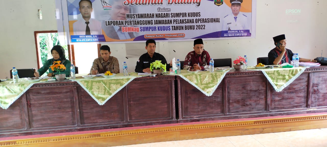HARIANHALUAN.ID – BUMNag Sumpur Kudus melaksanakan musyawarah nagari (Musnag) tahun 2023 di Kantor Wali Nagari Sumpur Kudus, Kamis (9/2/2023).