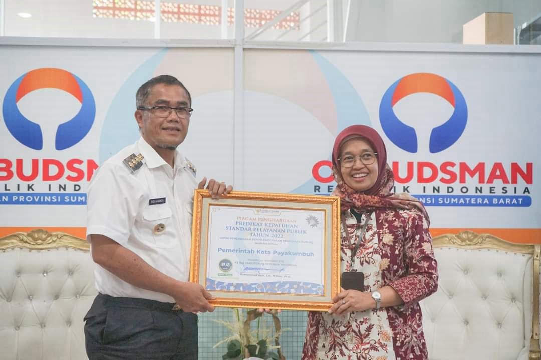 PAYAKUMBUH, HARIANHALUAN.ID — Penjabat Wali Kota Rida Ananda kembali menunjukkan hasil yang luar biasa dalam kinerjanya. Pasalnya, tahun 2023 ini diawali oleh sebuah prestasi manis dengan meraih penghargaan Penilaian Kepatuhan Penyelenggaraan Pelayanan Publik Tahun 2022 yang serahkan oleh Kepala Ombudsman RI Perwakilan Sumatera Barat Yefri Heriani di Padang, Rabu (8/2).