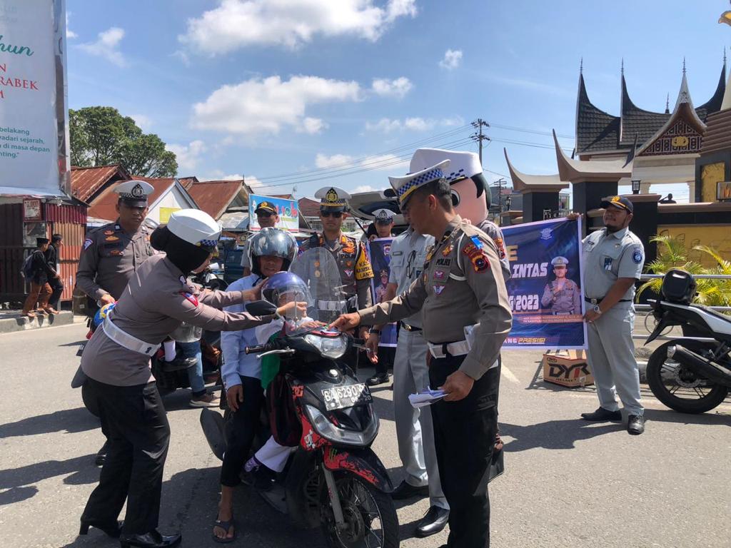 HARIANHALUAN.ID – Satlantas Polresta Bukittinggi mengelar Kampanye Keselamatan Berlalulintas dalam rangka Operasi Keselamatan Singgalang 2023 di Simpang Tugu Polwan, Jumat (17/2/2023).